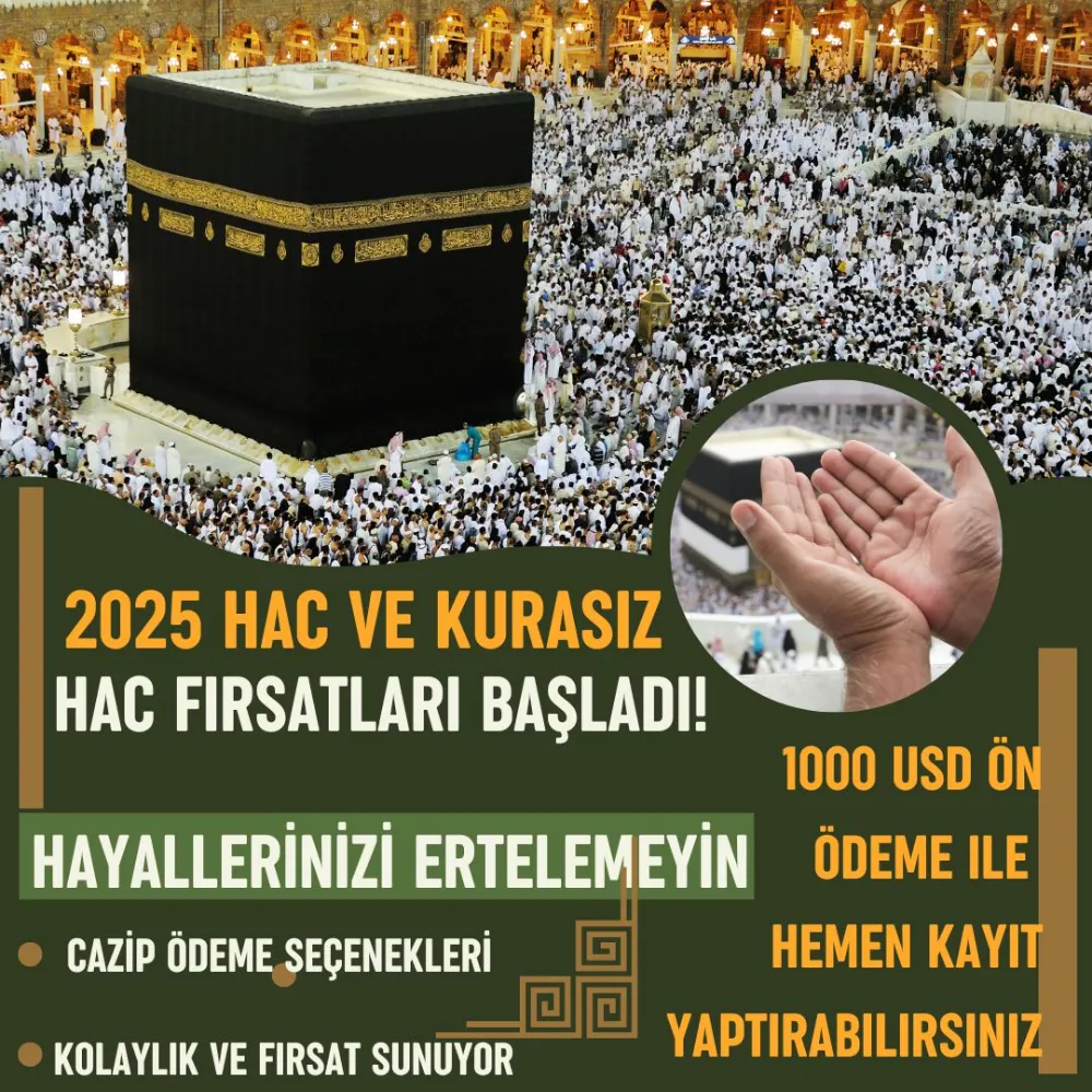 2025 hac ve kurasız hac fırsatları başladı! 1000 USD ön ödeme ile kutsal topraklara ulaşmanın tam zamanı. Detaylı bilgi için hemen başvurun!