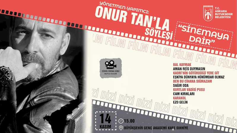 Ankara Büyükşehir Belediyesi, Dünya Sinema Günü nedeniyle Yönetmen ve Yapımcı Onur Tan’ın konuk edileceği “Sinemaya Dair” konulu söyleşiye ev sahipliği yapacak.