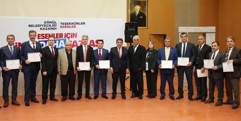 AK Parti Esenler İlçe Başkanı Umut Özkan, MHP İlçe Başkanı Suat Yılmaz başta olmak üzere siyasi parti ilçe başkanlarının da katıldığı törende; 5 yıl Esenler Belediye Meclisi'nde görev yapacak yeni meclis üyeleri ve mahalle muhtarları da mazbatalarını aldılar. Esenler Belediye Başkanı M. Tevfik Göksu İlçe Seçim Kurulu'nda görev yapanlara birer çiçek takdim ederek seçim boyunca gösterdikleri yoğun çalışmalardan dolayı teşekkür etti. Mazbataların takdiminden sonra Esenler Belediye Başkanı ve parti ilçe başkanları hep birlikte yeni meclis üyeleri ve muhtarlarla birer hatıra fotoğrafı çektirdiler.