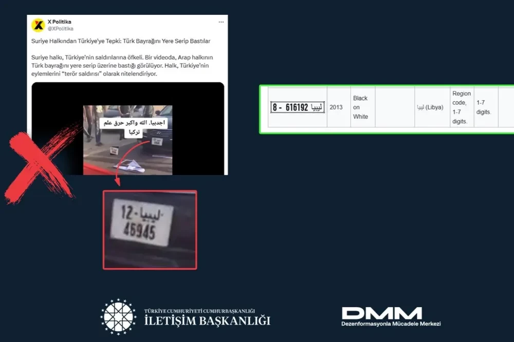 "Terör örgütü PKK/PYD propagandası yapan sosyal medya hesaplarından paylaşılan bazı görüntüler ile ilgili, 'Suriye halkı Türkiye'ye tepki göstermek için Türk Bayrağını yere serip bastı' iddiası doğru değildir. Görüntülerde yer alan araçların Libya plakalı olduğu belirlenmiştir."