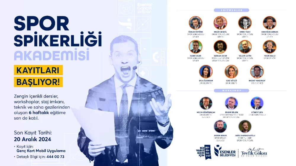 Esenler’de ikamet eden 15-29 yaş arası gençlerin katılımına açık olan Spor Spikerliği Akademisi, 6 hafta sürecek yoğun bir eğitim programı sunuyor. Gençler, bu süreçte spor spikerliği mesleğinin tüm inceliklerini öğrenerek hayallerine bir adım daha yaklaşacak.
