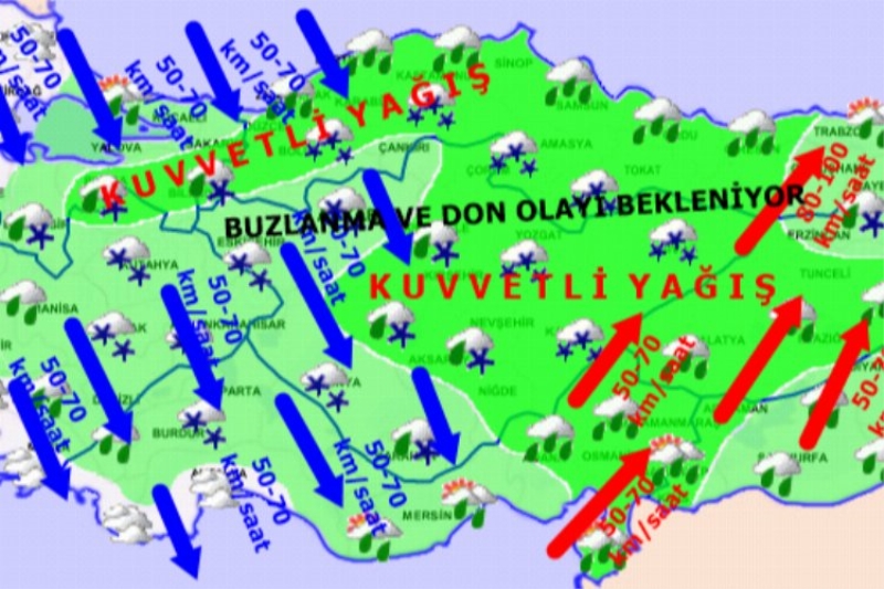 Meteoroloji Genel Müdürlüğü tarafından yapılan son değerlendirmelere göre: Ülkemiz genelinin çok bulutlu, Güney Ege kıyıları ile Batı Akdeniz'in kıyı kesimleri dışında bütün bölgelerin yağışlı geçeceği tahmin ediliyor. Yağışların Orta ve Doğu Akdeniz ile Orta ve Doğu Karadeniz kıyılarında yağmur ve sağanak diğer yerlerde karla karışık yağmur ve kar şeklinde olmak üzere; Doğu Akdeniz, İç Anadolu'nun doğusu, Karadeniz, Doğu Anadolu'nun kuzey ve batısı ile Bursa, Bilecik, Sakarya, Bitlis, Şırnak, Hakkari, Gaziantep, Kilis ve Adıyaman çevrelerinde yer yer kuvvetli olması bekleniyor. Güneydoğu Anadolu'nun güneydoğusu ile Doğu Anadolu'nun güneydoğusunda yer yer toz taşınımı görüleceği tahmin ediliyor. Doğu Karadeniz’in iç kesimleri ile Doğu Anadolu’nun eğimli ve yüksek kesimlerinde çığ tehlikesi riski bulunmaktadır.
