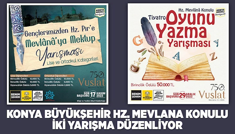 Konya Büyükşehir Belediyesi tarafından Hazreti Mevlana'nın 750. Vuslat Yıl Dönümü ve 2023 Mevlana Yılı Etkinlikleri kapsamında “Hz. Mevlana Konulu Tiyatro Oyunu Yazma” yarışması ile ortaokul ve liselerarası “Gençlerimizden Hz. Pîr’e Mektup” yarışması düz