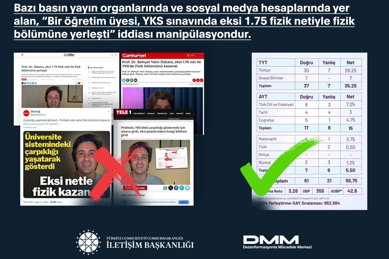 İletişim Başkanlığı Dezenformasyonla Mücadele Merkezi, "Bir öğretim üyesi, YKS sınavında eksi 1.75 fizik netiyle fizik bölümüne yerleşti" iddiasının doğru olmadığını açıkladı.