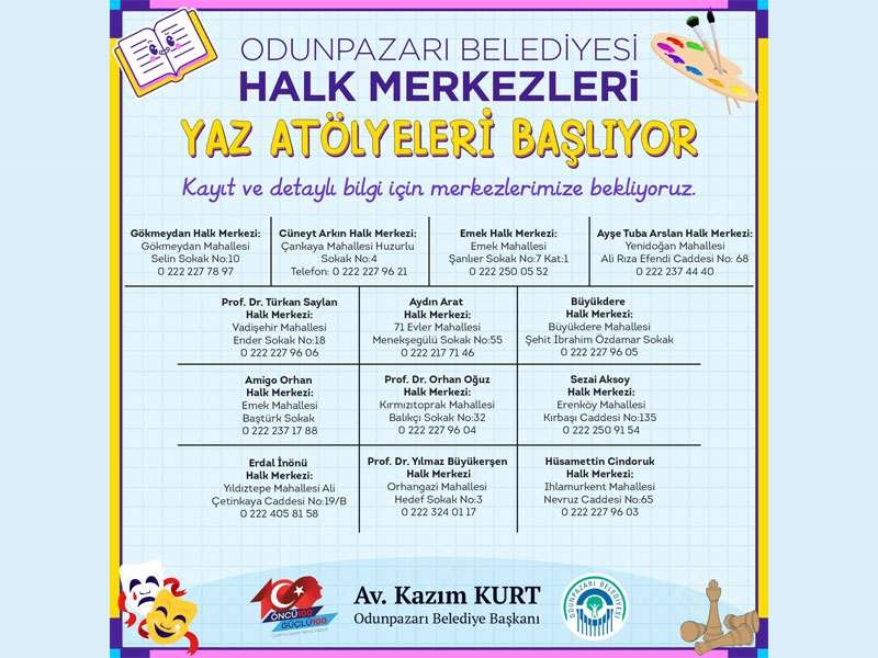 Odunpazarı Belediyesi Yaz Atölyeleri ile ilgili ayrıntılı bilgi almak isteyen vatandaşlar, Odunpazarı Belediyesi Halk Merkezlerine giderek ya da telefonla arayarak bilgi alabilir. Ayrıntılı bilgi için; Gökmeydan Halk Merkezi (Gökmeydan Mahallesi Selin Sokak NO:10) (0 222) 227 78 97, Cüneyt Arkın Halk Merkezi (Çankaya Mahallesi Huzurlu Sokak NO: 4) (0 222) 227 96 21, Emek Halk Merkezi (Emek Mahallesi Şanlıer Sokak NO: 7 Kat:1) (0 222) 250 05 52,