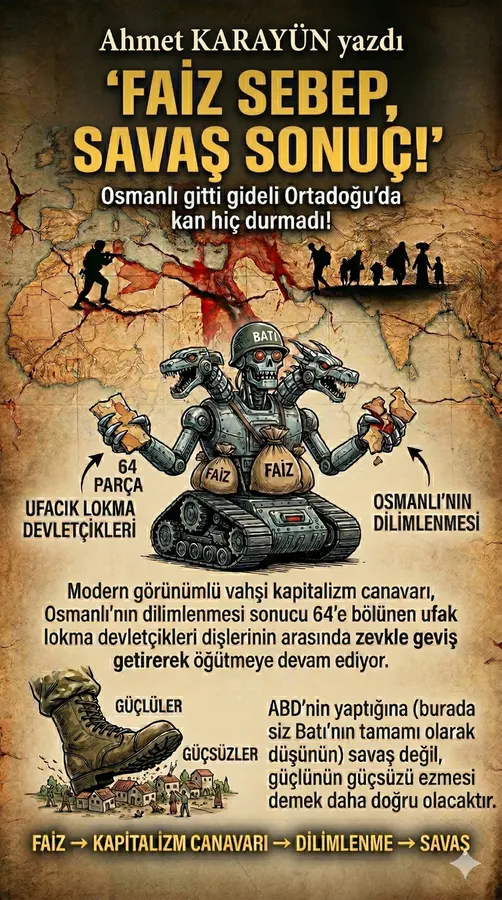 Anahtar Kelimeler: ahmet karayün yazıları, faiz, savaş, kapitalizm, sömürü sistemi, adalet, ekonomik düzen, güç dengesi, küresel sistem, sermaye gücü, Kur’an-ı Kerim, Bakara Suresi 279, Allah’ın emirleri, haram ve helal, ilahi adalet, hak ile batıl, şeytanın yolu, ümmet bilinci, hilafet, Osmanlı İmparatorluğu, Ortadoğu, Amerika Birleşik Devletleri, İsrail, Afganistan’ın ABD tarafından işgali, küresel güçler, emperyalizm, böl-parçala-yönet, dış borç, 1854 Osmanlı borçlanması, faiz sistemi eleştirisi, borç sarmalı, finansal kölelik, gelir adaletsizliği, zengin-fakir uçurumu, para politikaları, küresel finans düzeni, güçlünün güçsüzü ezmesi, katliam, işgal, savaş politikaları, küresel manipülasyon, medya ve algı yönetimi, toplumsal yozlaşma, ahlaki çöküş, insan doğası, iktidar mücadelesi, medeniyet çatışması, faiz sebep savaş sonuç, görünmez sömürü, finansal kölelik düzeni, küresel sistemin karanlık yüzü, adaletin çöküşü